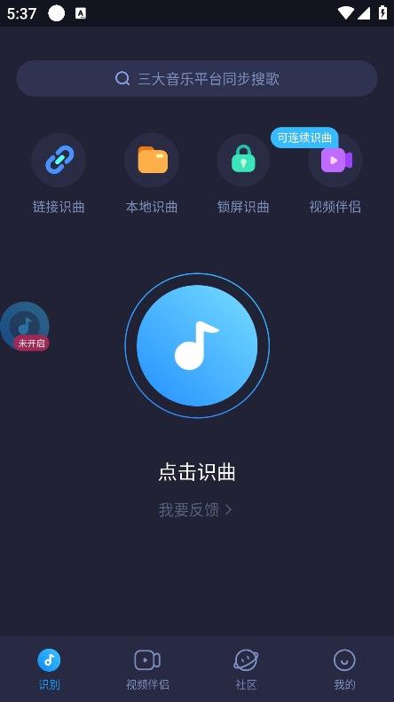 1、进入软件,点击听歌识曲即可识别正在播放的音乐,软见还支持通过链接、本地、锁屏的方式进行识曲;