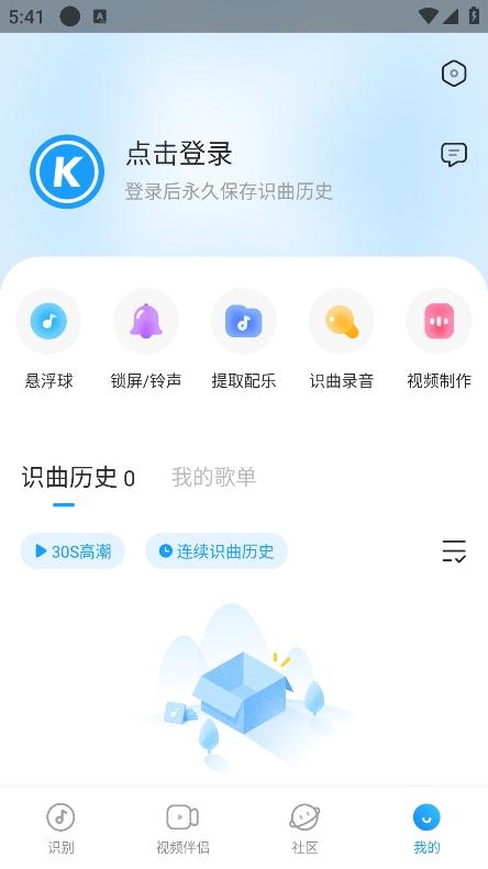 4、我的页面中你可以查看你自己的识别历史以及个人歌单,还集成了配乐提取、识曲录音以及视频制作的功能。
