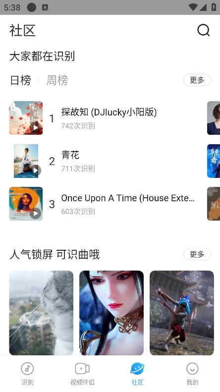 3、在社区中你可以发现大家都在识别的歌曲,有日榜周榜的榜单内容呈现;