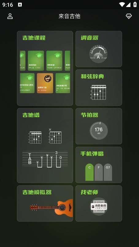 1、打开软件后,你可以发现有多个功能模块,提供吉他课程、调音器、和弦辞典、节拍器、吉他谱、手机弹唱以及吉他模拟器;