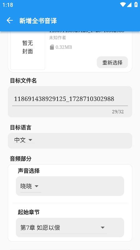 3、完成导入后,选择目标语言,设定你需要的音频,选择起始的章节;