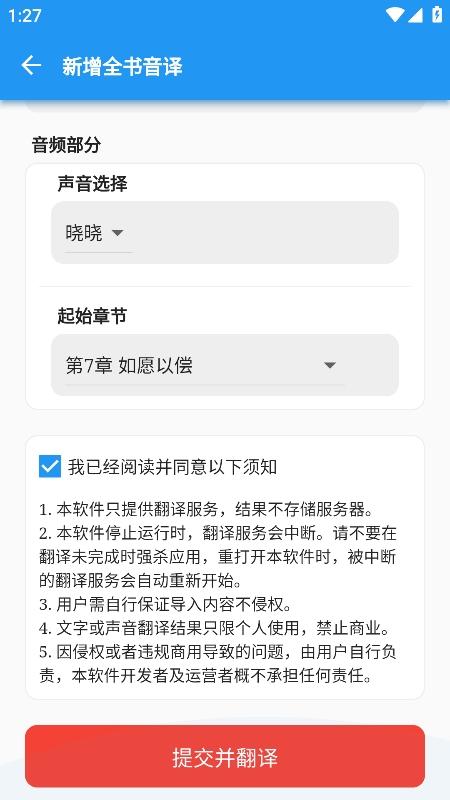 4、勾选同意须知,然后点击提交并翻译;