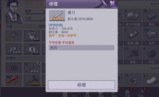 3、最后,可以看到其中本不可修复的唐刀就会出现修理两个字了,点击【修理】即可。