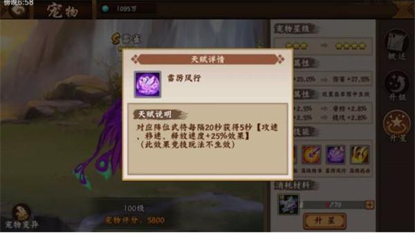 宠物对于携带者有着极大的属性及伤害加成,并且宠物的技能天赋也有不同程度的提升,因为不同的宠物也对应不同的武将,才能够发挥其最大化的效果。S级宠物雷雀,三天赋提升攻速、移速、释放速度,四天赋提升普攻速度,优先携带者:荀彧。众所周知,荀彧的小技能伤害高并且CD短,如此看来朱雀对于荀彧就是绝配,提升技能释放速度和普攻速度,可以让荀彧小技能的伤害输出最大化。