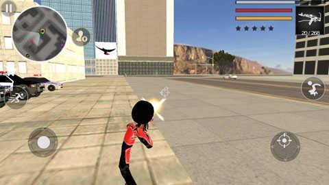 游戏玩法:左侧遥感,主要控制移动,右侧攻击、跳跃,遇到载具还会浮生驾驶控件,同时最为亮眼的就是绳索这一功能的加入,让你只需要瞄准目标即可快速远距离的进行移动,与蜘蛛侠的技能相仿。