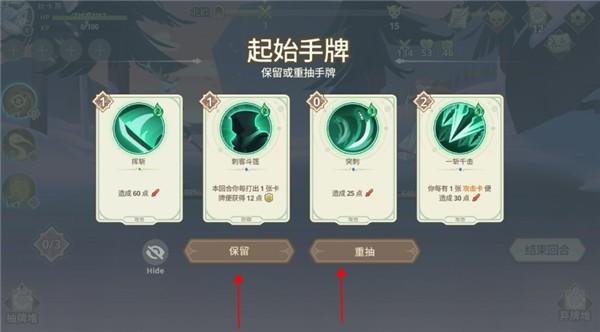 4、战斗开始后我们会抽取起手手牌,如果不满意有一次重新抽取的机会