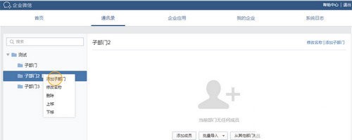 点击“通讯录”的部门旁的三角符号或者在成员列表右上角进行添加子部门。与此同时还提供了修改部门名称、调整部门顺序等操作。