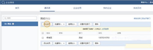 点击“通讯录”-“添加成员”,编辑成员的姓名、英文ID、职务、部门、性别、手机、座机、个人邮箱等信息,其中姓名、手机、部门是必填字段。
