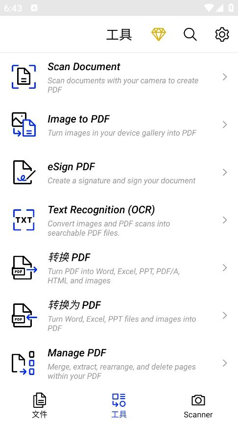 3、工具栏中集成了丰富的工具,支持文档扫描、文件格式转换处理等;
