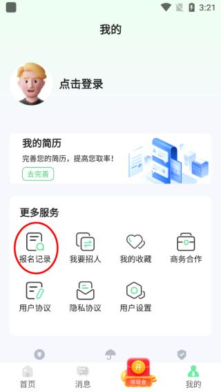 2、在我们页面里的更多服务中找到报名记录,点击进入。