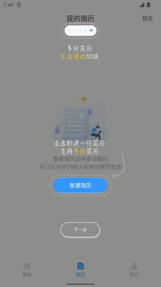 2、切换到【简历】界面。上方的小点能左右滑动进行多份简历的切换,点击下方的“新建简历”,就能创建一个新的电子简历信息