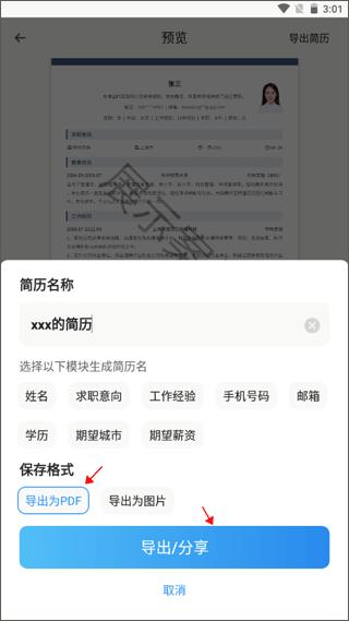 3、给自己的文档去一个名称,保存格式为PDF,最后点击“导出/分享”就能保存到手机上成为电子档的简历了