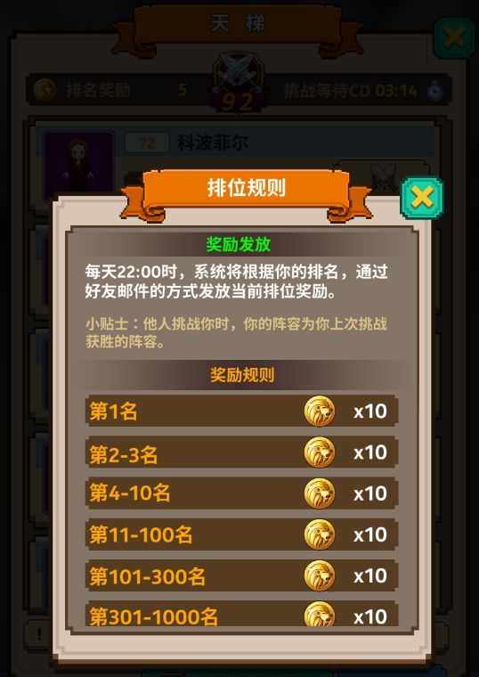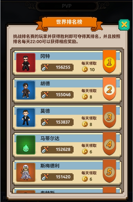 同样每天可以挑战10次,挑战成功可以获得排名奖励,挑战排名赛的玩家获得胜利即可夺得世界排名,并且按照排名每天22:00可以获得相应奖励,通过好友邮件的方式发放当前排名奖励。