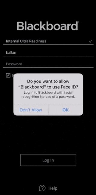 Blackboard Learn应用程序支持iOS面部识别。目前不支持安卓面部识别。在你的设备上设置了Face ID之后,你可以使用面部识别来登录Blackboard Learn应用程序。