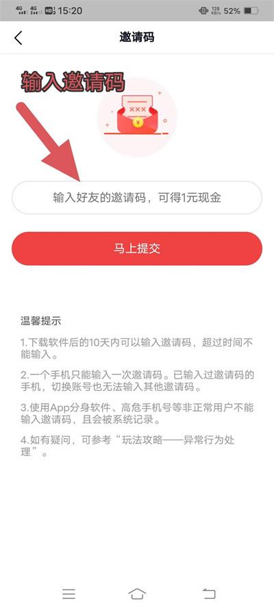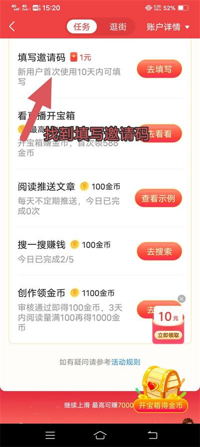 2、在任务页面下滑,可以找到填写邀请码的入口;