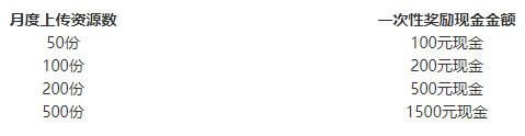 2、每上传审核通过一份资料,奖励1元现金。此外,资源按照被下载情况奖励现金提成,标准如下: