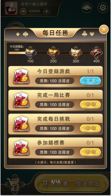 四个任务,每个任务增加100活跃度。活跃度达到可以开启宝箱,完成一个任务增长一段进度条,进度条满了可以打开宝箱。进度条分为四段。未完成则显示前往可以点击,点击前往后进入到相应的游戏界面。完成奖励活跃度进度条增长可以开启宝箱。第一个宝箱+5金币 第二个宝箱+10金币 第三个宝箱+20金币。第四个宝箱赠送魔法道具*1