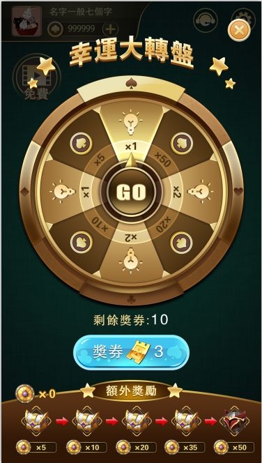 包含8个格子,分为4个金币4个道具格子,金币分别为X5,X10,X20,X50;道具分别为X1,X1,X2,X2下方为抽奖礼盒,分为抽5次,10次,20次,35次,50次五种进度宝箱,每积满50次重新计算。抽奖消耗奖票,每次消耗*3张奖票。抽奖票:用来参加转盘抽奖,可在每日挑战里获得。