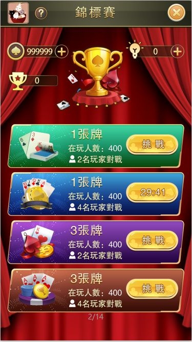 四种模式:双人抽一张牌,4人抽一张牌,双人抽三张牌,四人抽三张牌。对照界面显示双方头像和对局得分,自己用时,移动步数,可以免费使用三次提示功能,继续使用弹出消耗金币弹框弹框,设置按钮,点击设置。设置界面增加退出功能按钮,退出提示认输,确认离开。四人模式下前三名结算显示“YOU WIN”,第四名显示“YOU LOSE”。双人模式下胜利显示“YOU WIN”并显示金杯,输了则显示失败结算界面。