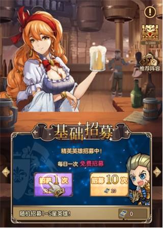 新手引导:玩家创角成功进入游戏后需要根据系统的要求完成新手任务,过程中玩家可以在酒馆-高级招募进行一次招募,该招募必出一个5星英雄,前期尽可能优先培养该英雄,该英雄培养起来后前期的关卡基本能通关。