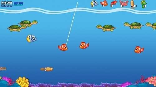 5、钓鱼方法很简单,我们只要点击屏幕,上方的鱼线就会向下延长,当鱼线顶端刚好碰到鱼,就能将它吊起来了。这个大家多尝试几次就可以轻松钓到鱼。