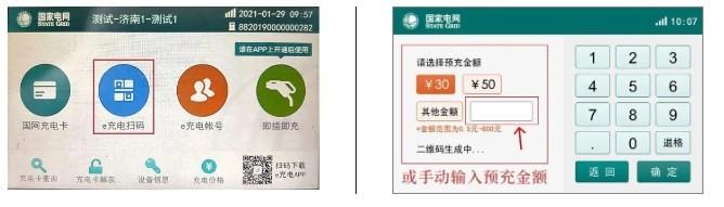在充电桩屏幕上选择充电方式,选择【扫码充电】,选择输入预充金额(预充金额不能大于您的账户余额);也可在输入框中手动充电金额,点击确定,生成充电二维码。
