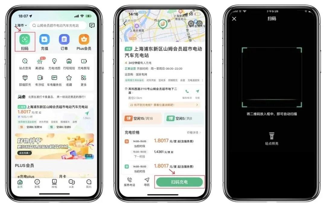 点击e充电app首页左上方【扫码】图标或该充电站详情页右下方的【扫码充电】图标,进入扫描界面,用e充电app扫码充电桩屏幕中间的二维码,开启充电。