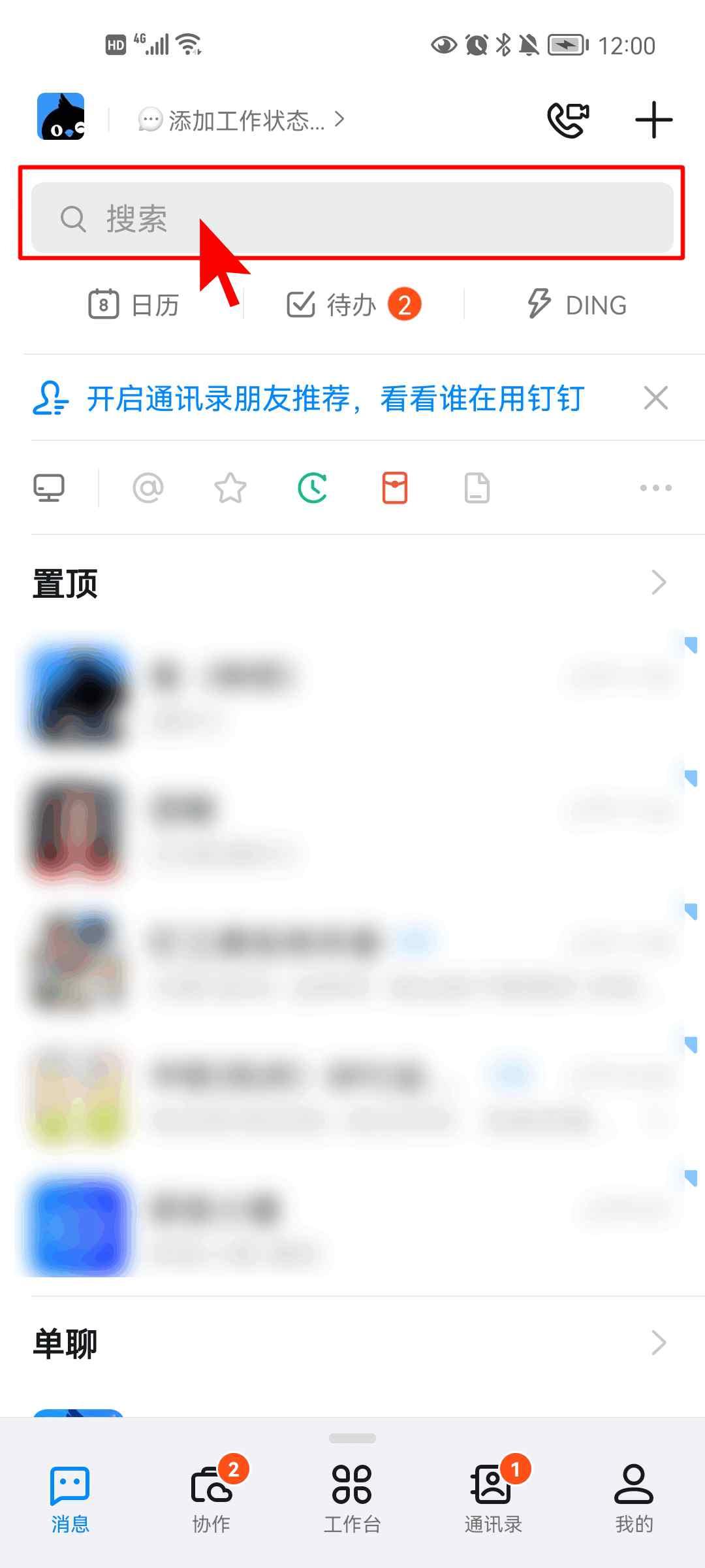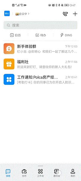 1、在腾云网下载安装钉钉app最新版本,同时运行软件会看到消息、文档、工作台、通讯录、发现五个板块,在消息里有着日历、待办、ding、最近联系人等功能: