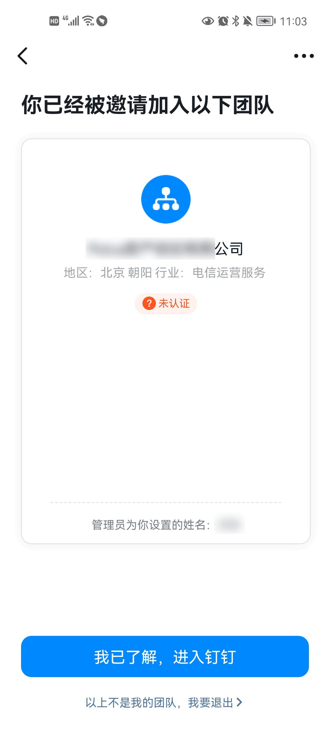 若您是刚刚注册钉钉账号的新用户,且团队向您发送了加入邀请,初次登录钉钉时页面会提示已被邀请加入团队,点击“我已了解,进入钉钉”