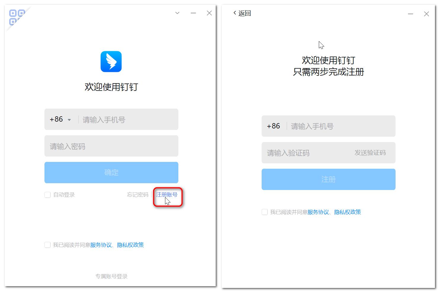 电脑端钉钉 在引导页点击下方 注册账号,打开后可直接输入手机号、验证码 ,点击 注册 。