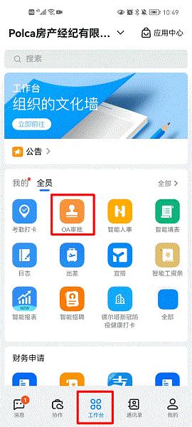 进入【工作台】-【OA审批】,OA审批中提供了假勤、人事、财务、行政等多种审批,如下图所示