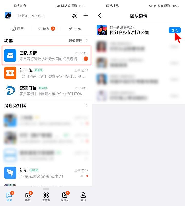 您将会在钉钉内收到团队邀请消息,点击加入即可