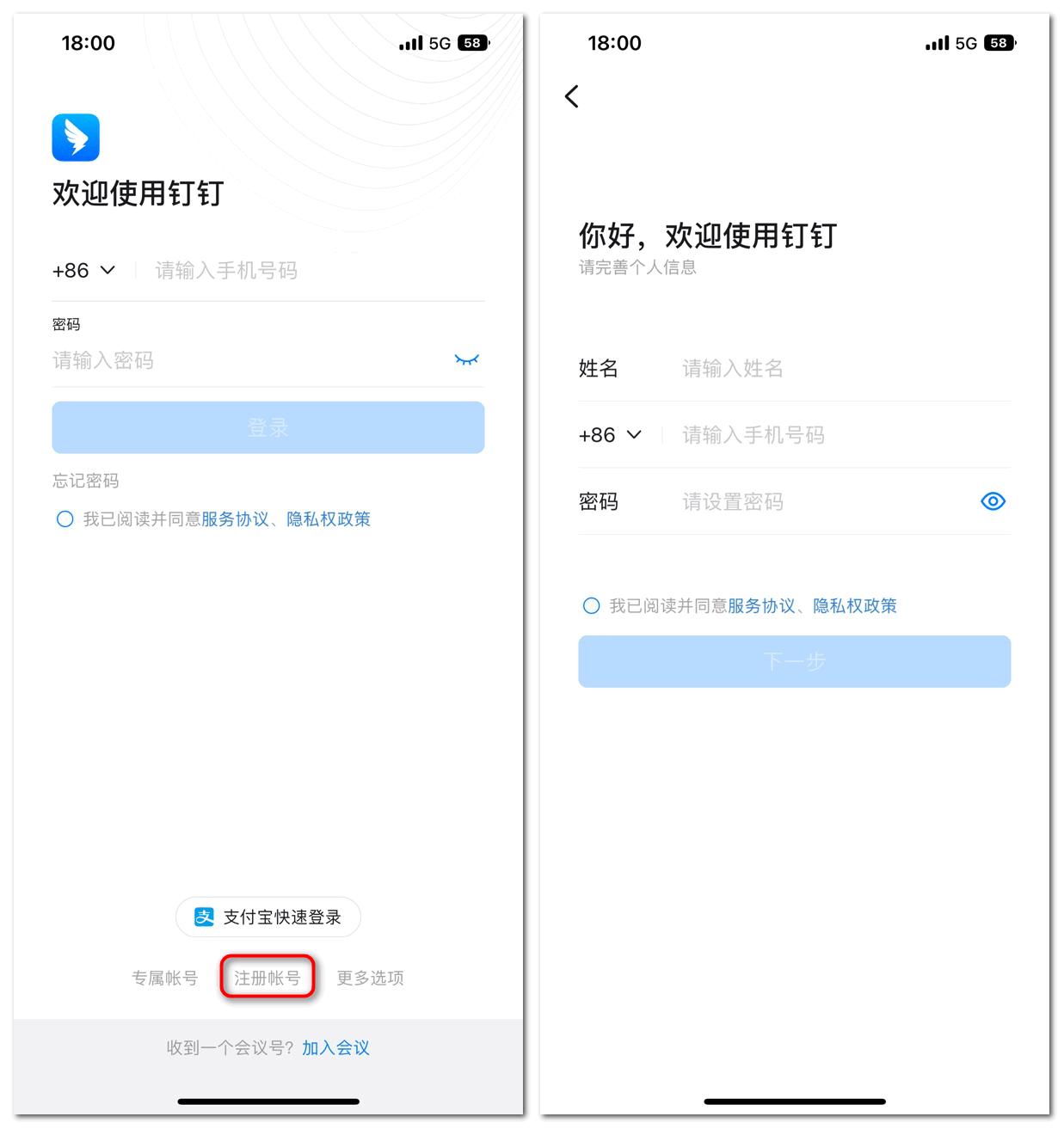 注: 若是境外手机号码,不支持使用境外手机号码注册,建议在手机端钉钉使用邮箱号注册钉钉账号,注册后再绑定境外/大陆手机号码。
