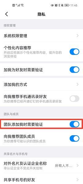 ① 若您在【我的】-【设置】-【隐私】中开启了“团队添加我时需要验证” ,如下图