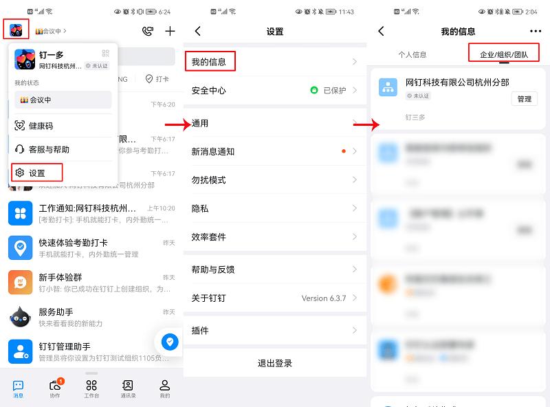 点击头像-【设置】-【我的信息】-【企业/组织/团队】查看所属组织