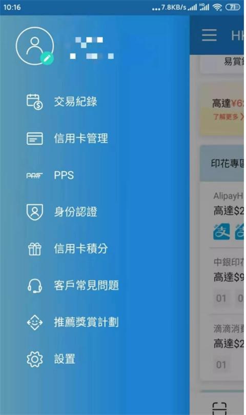 3、点击左上角的三道横綫。打开如下界面,可以查看交易记録,信用卡管理,PPS,身份认证,设置等。