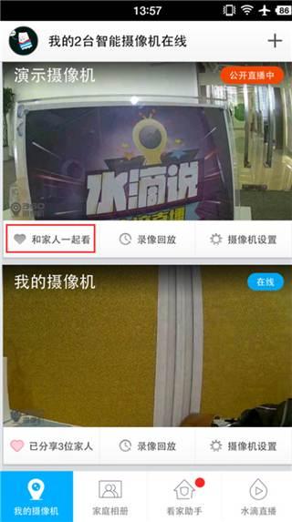 3、此时,家人点击APP首页右上角的“+”然后选择“连接家人的摄像机”——“扫描二维码连接家人的摄像机”;