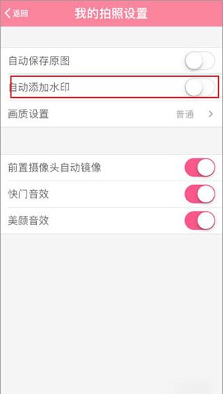 5、将设置栏中显示的自动添加水印按钮关掉后,拍出的照片上就没有水印了。