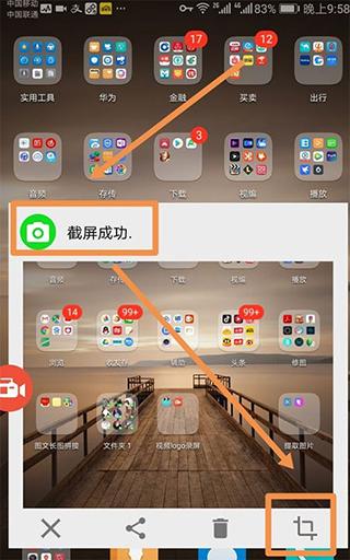 3、之后应用会对手机屏幕截图,屏幕中出现截图成功字样,下方左侧有关闭、分享、删除标志,最右侧的是裁切标志。