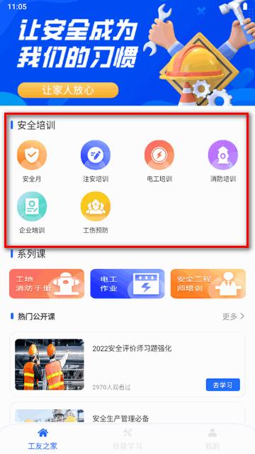 2、进入软件后,来到了工友之家,选择安全培训。