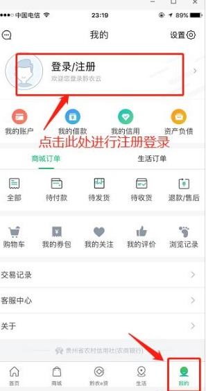 1、打开贵州农村信用社手机银行app,点击右下角“我的”,点击上方“登录/注册”进行注册账号并登录。