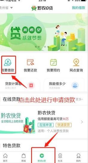 2、登录成功之后,回到“黔农e贷”页面,现在左上角选择行政区,然后点击“我要借款”。