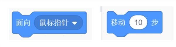鼠标指针在场景中进行移动,老鼠面向鼠标指针移动,然后小猫面向老鼠进行移动。这样,只要鼠标指针在不停地移动,老鼠和小猫都相应地移动。