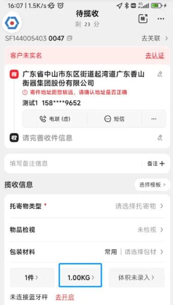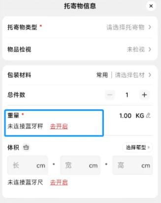 4.揽收任务创建后,界面如下,点击图示“1.00kg”,进入寄托物信息界面,点“去开启”,打开蓝牙,准备连接电子秤。