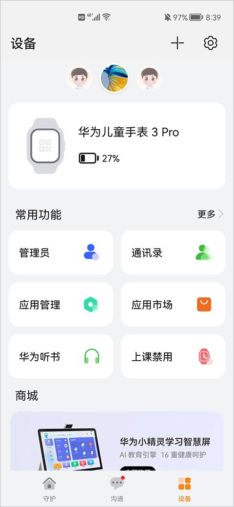 3、管理多台儿童手表时,在智能关怀应用中点击设备,点击页面上方儿童手表头像可以进行切换。最多可以绑定10台儿童手表(仅支持绑定华为、荣耀品牌的儿童手表)。