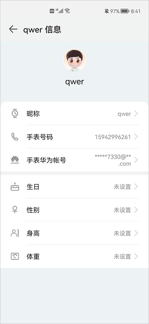 4、需要修改宝贝的信息时,在智能关怀应用中点击沟通,点击页面上方儿童手表头像可进入宝贝信息界面,修改昵称、头像、性别、出生日期等宝贝信息。