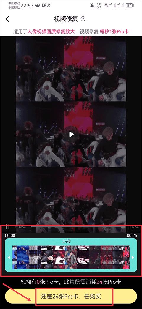 然后在相册中选择要修复的视频,在下方拖动边框可以截取视频片段,并使用pro卡进行修复即可;