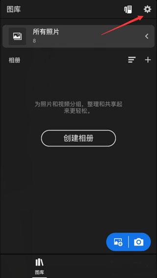 2、进入到LR首页里面后,在图库的最右上角有设置图标。