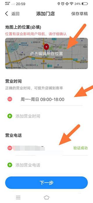 3、然后在地图上编辑店铺位置,填写营业时间以及营业电话,如图所示;