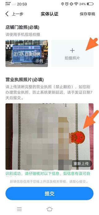 4、拍摄店铺门脸,上传营业执照照片即可。